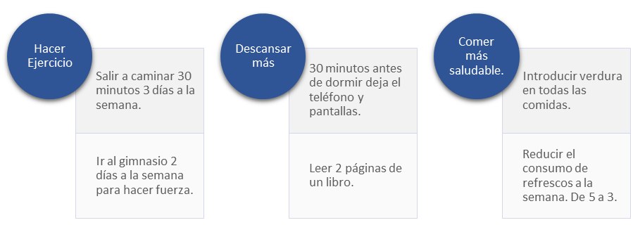 Un ejemplo podría ser: Salir a caminar 30 minutos los lunes, miércoles y viernes, antes de cenar.